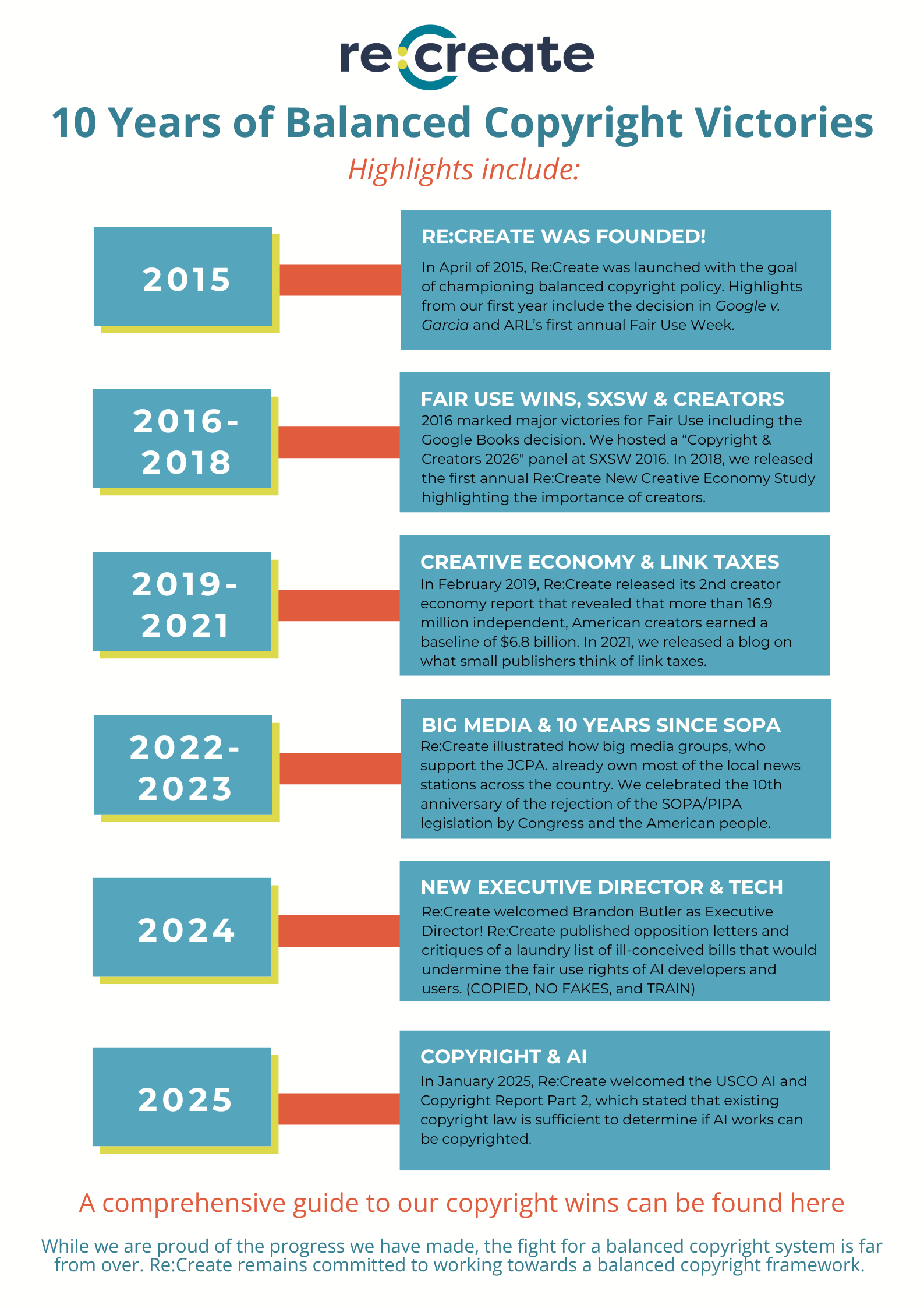 This month marks 10 years since Re:Create launched! Since 2015, Re:Create has championed balanced copyright policies that protect a free and open internet, benefit creators, users and innovators, and safeguard the core American value of free expression. To honor our past and ongoing efforts to support a pro-innovation, pro-consumer, pro-creator copyright framework, Re:Create members highlighted the decade of impact the coalition has made on balanced-copyright issues.