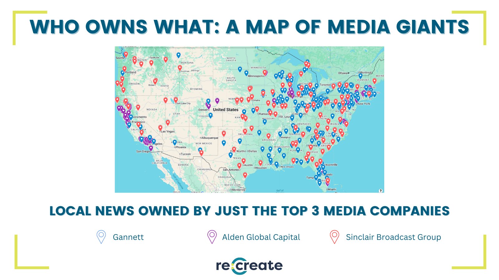 To the average consumer, local news may seem…local – but in reality, a few hedge funds – many of which have little knowledge or interest in supporting local journalism – and large media conglomerates own and operate most of the newsrooms shaping local headlines. In 2022, Re:Create published a blog post revealing the unparalleled influence of just three major media conglomerates that owned hundreds of outlets: Alden Global Capital (a hedge fund, not a media company), Gannett, and Sinclair Broadcast Group. While these are the most powerful players in the game, other media giants like McClatchy and Hearst are also contributing to the local news takeover.